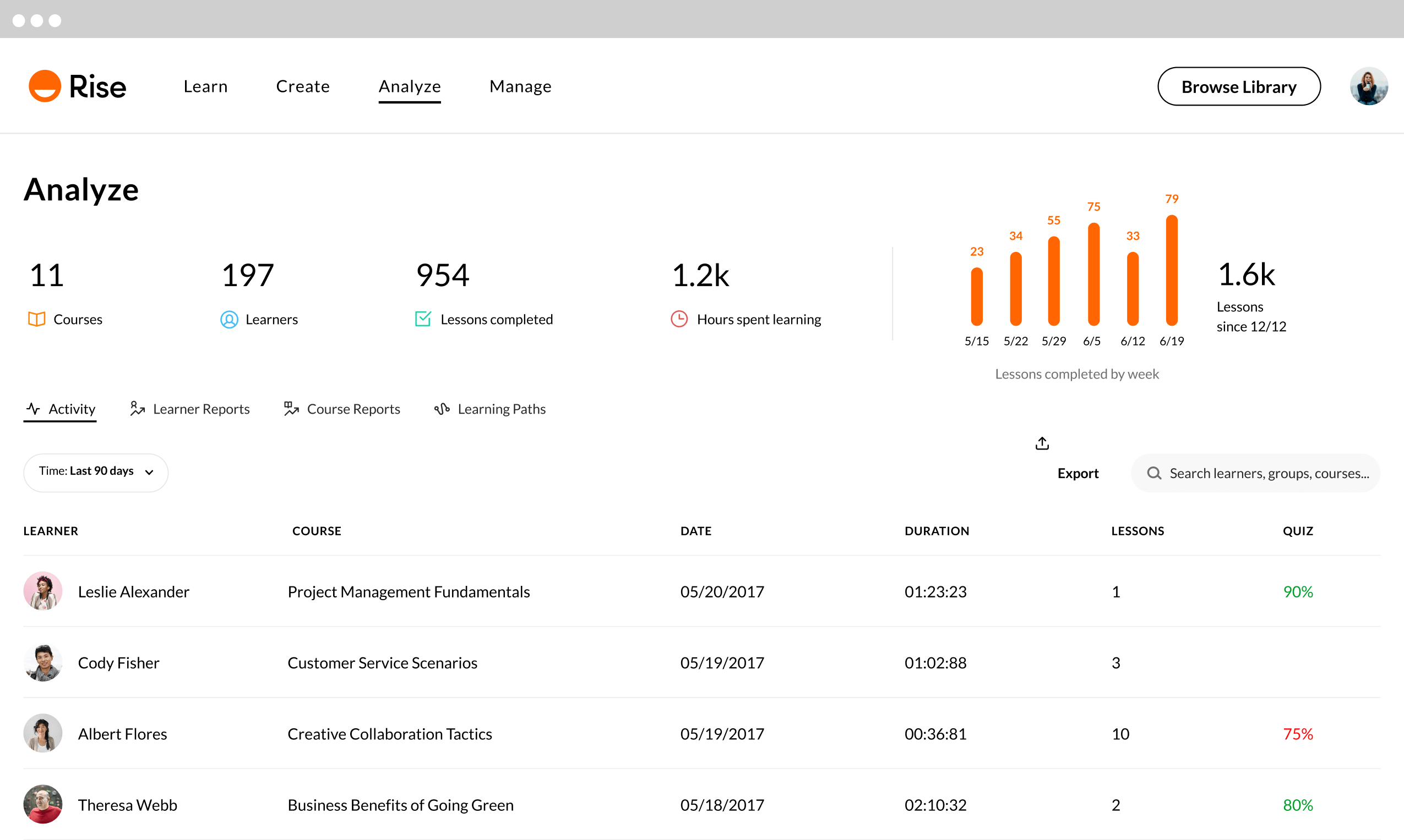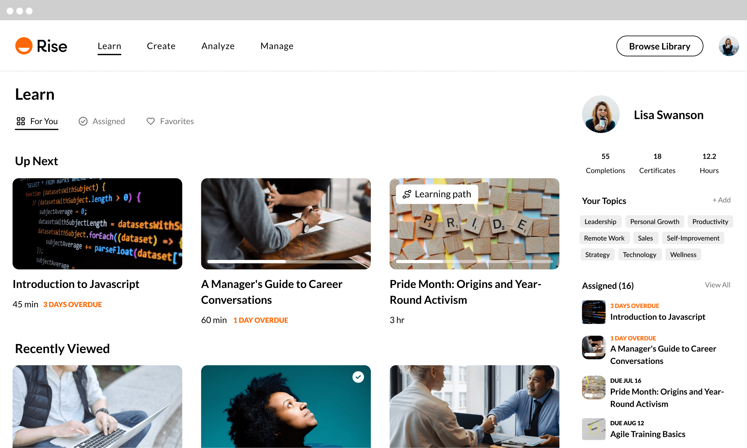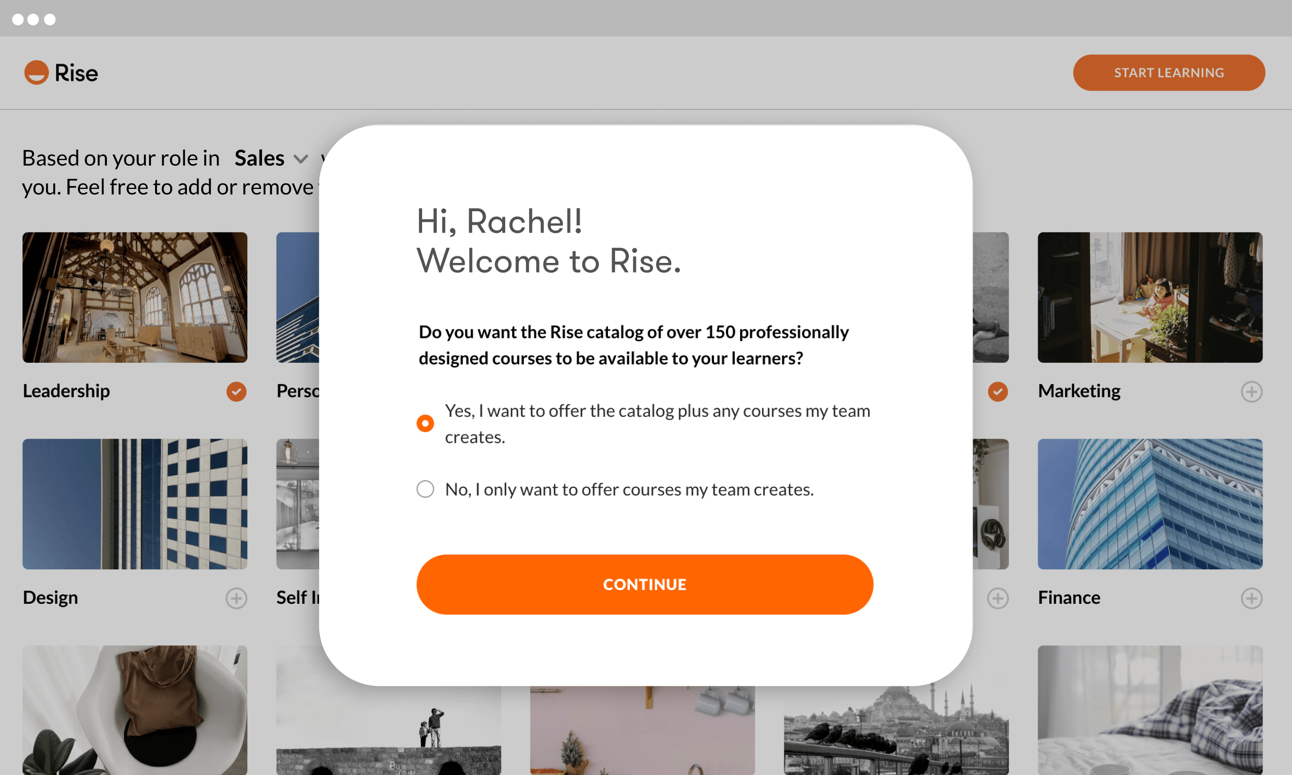 Grant learners access to the complete Rise course catalog—including hundreds of professionally developed courses—instantly.
