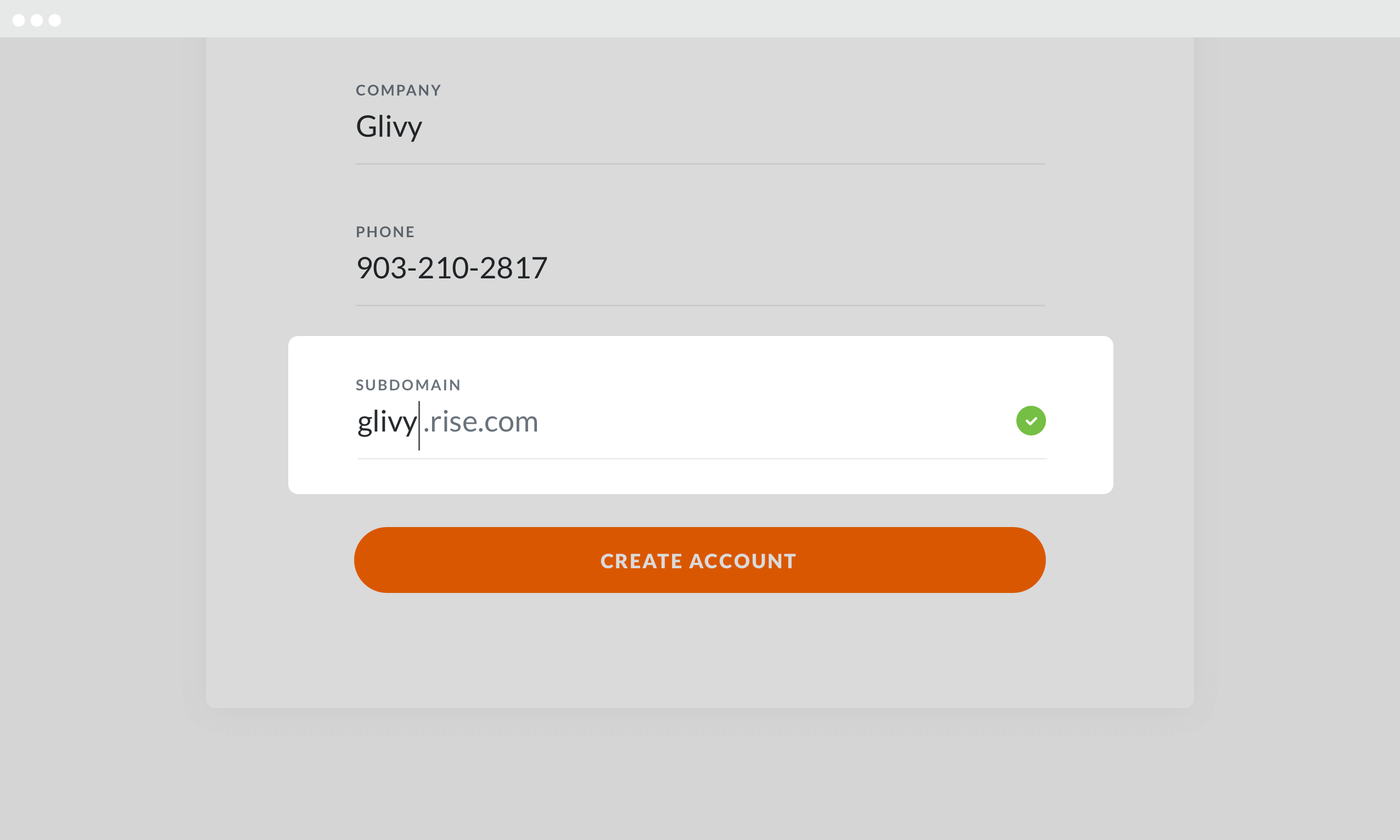 Claim your .rise domain to get started. For example, if you work at Glivy, set up your Rise account as glivy.rise.com
