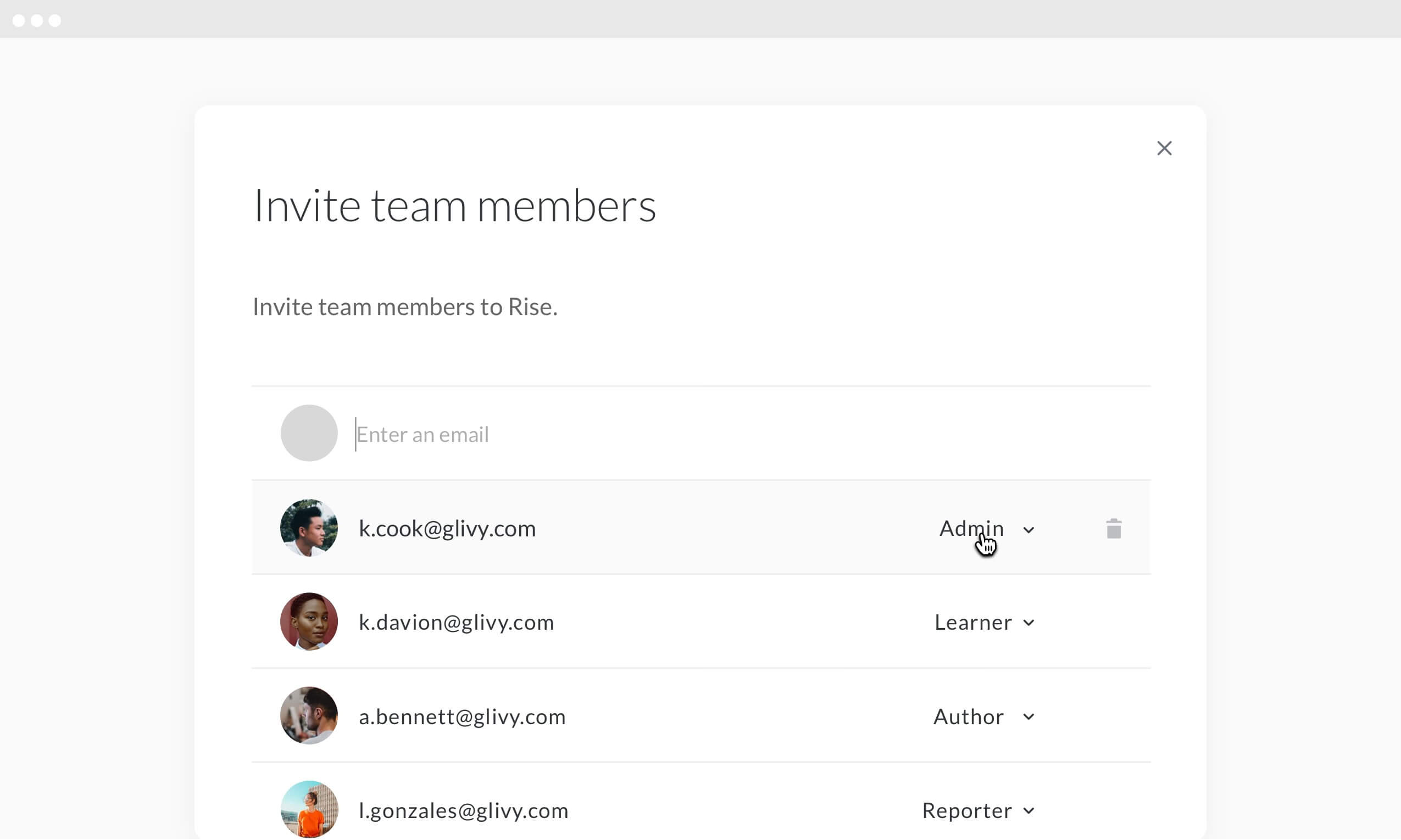 Add admins, content creators, reporters, and learners, then set their permissions. You can do this step at any time.